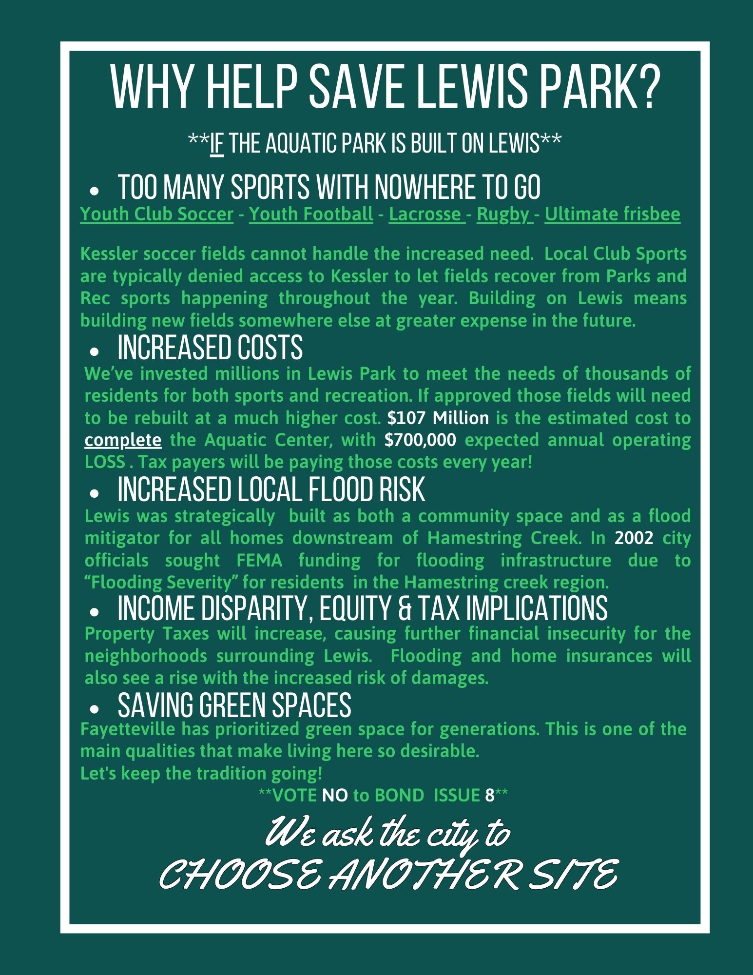 Preferred site from feasibility study is Lewis Park. We save the park by making the city rethink their plans to destroy 4/6 full sized fields. These fields are vital, central, and needed. Please ask the city to consider other options suggested in their study.